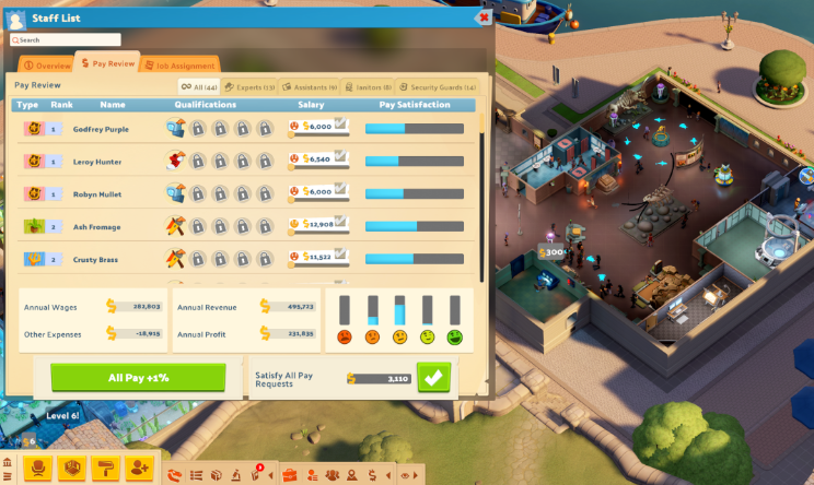 게임이 진행됨에 따라 다양한 과제들이 주어집니다. 초기에는 새로운 게임 메커니즘을 배우거나, 전시 관람 경험을 개선하는 데 집중하게 되죠. 그러나 점차 더 커다란 도전이 다가옵니다. 특히, ‘직원들의 급여 만족도’를 75% 이상 맞추라는 미션이 있었습니다. 솔직히 말하면, 이 부분은 제가 전혀 신경 쓰지 않았던 부분이었죠. 직원들이 가끔 급여에 대해 불평하고 떠나겠다고 위협하는 상황이 발생하곤 했지만, 급여를 조금 올려주면 금방 해결됐습니다. 하지만, 전 직원의 급여 만족도를 맞추는 것은 생각보다 어려운 일이었습니다.