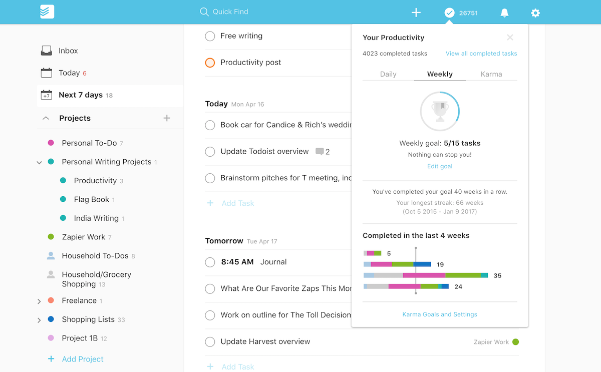 Todoist 는 생산성을 위한 피트니스 트래커입니다. 체크할 때 작업을 추적한 다음, 오늘과 이번 주에 얼마나 생산성이 있었는지, 그리고 개선되고 있는지 여부를 보여줍니다. 이 데이터는 앱 상단 모서리에 있는 개인 Todoist Karma 점수로 통합되며, 건강 앱의 만보기와 마찬가지로 계속해서 수치를 높이고자 하는 동기를 갖게 될 것입니다.