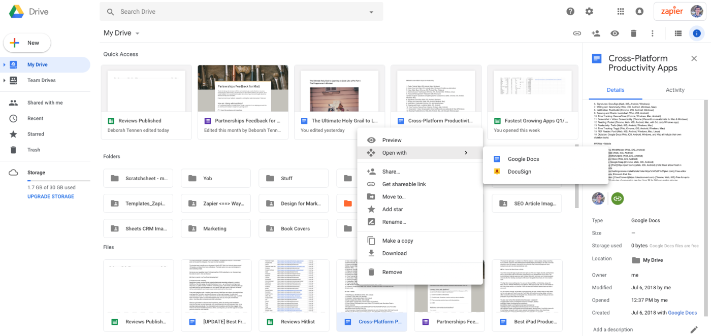 모든 파일을 저장하고 필요한 모든 곳에 보관할 수 있는 장소가 필요합니다. Google 드라이브 는 특히 업무용 웹 앱에 의존하는 경우 최고의 옵션 중 하나입니다. 가장 널리 사용되는 많은 웹 앱과 통합되어 예를 들어 LucidChart에서 다이어그램을 열거나 Google 드라이브에서 직접 DocuSign의 문서에 서명할 수 있습니다. 또한 문서, 스프레드시트, 프레젠테이션이 포함된 Google 자체 G Suite 앱이 함께 제공되어 사무실 요구 사항을 처리합니다.