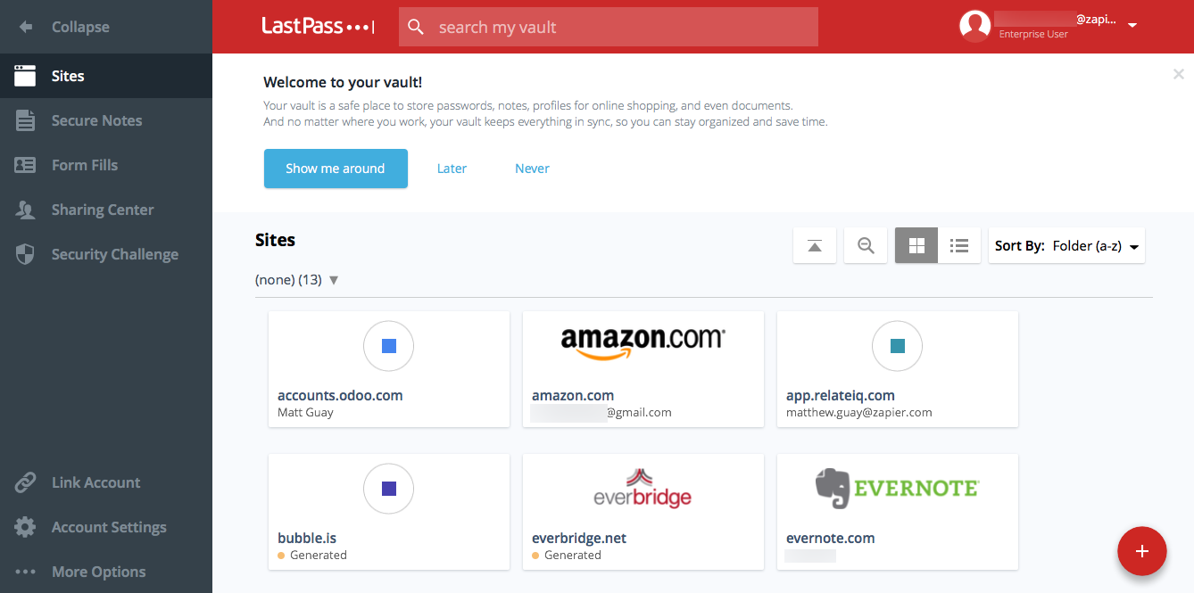 LastPass는 또한 양식을 작성하기 위해 신용 카드 정보, 주소 및 기타 중요한 데이터를 기억할 수 있으므로 매번 정보를 다시 입력할 필요가 없습니다. 계정에 안전하지 않은 비밀번호가 있는지 확인하고 자체적으로 업데이트하여 보안을 유지할 수 있습니다. 또한 가족 또는 팀과 암호를 공유하여 공유 계정을 관리할 수 있습니다.