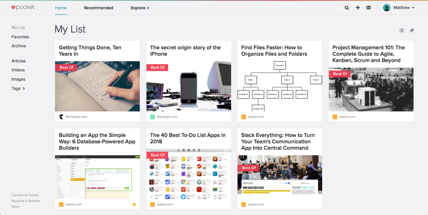 따라서 필수 사이트를 즐겨찾기 메뉴에 넣거나 브라우저가 가장 많이 방문하는 사이트를 결정하고 표시하도록 하십시오. 그런 다음 나머지를 Pocket 에 추가합니다 . 웹사이트의 할일 목록, 읽고 싶은 기사, 보고 싶은 동영상을 저장하는 곳입니다. 브라우저에서 포켓 버튼을 탭하여 파일을 정리하세요. 그러면 시간이 있을 때 거의 숨겨져 있는 책갈피를 검색하지 않고도 항상 읽거나 볼 것이 있습니다.