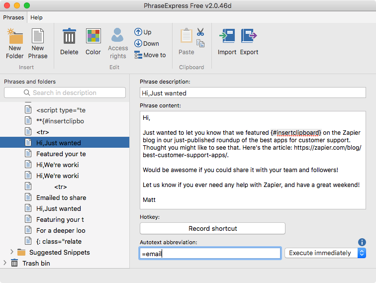 텍스트 스니펫 라이브러리를 구축하는 데 처음에는 약간의 시간이 걸릴 수 있습니다. 하지만 과거에 유사한 앱을 사용한 적이 있다면 스니펫을 가져와서 PhraseExpress에서 사용할 수 있습니다. 하지만 시간이 지남에 따라 몇 번의 키 입력으로 일상적인 이메일, 회사 정보 등을 입력하는 데 의존하게 될 것입니다.