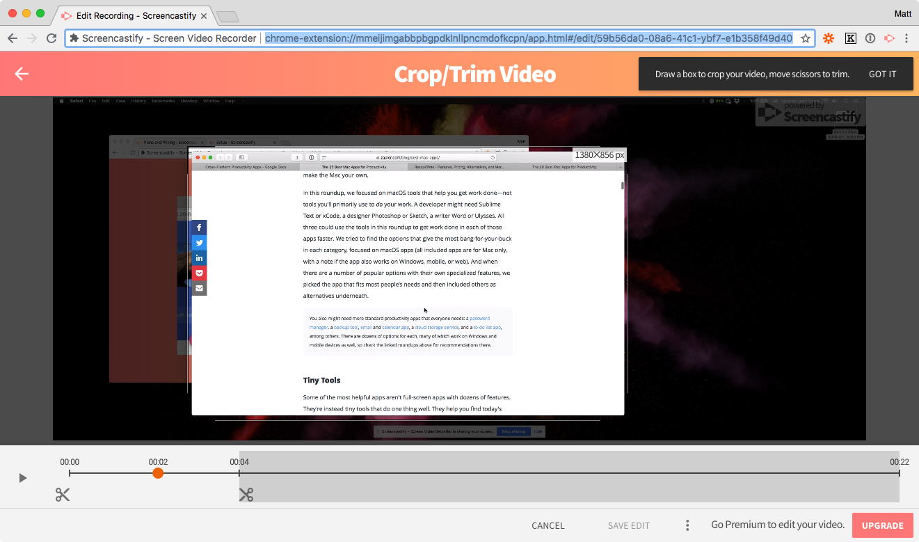 녹화가 끝나면 Screencastify의 편집기를 사용하여 비디오를 자르고 원하는 것을 정확하게 표시하도록 길이를 자르거나 유료 버전으로 다른 주석을 추가하십시오. 그러면 Screencastify가 자동으로 Google 드라이브에 저장하여 누구와도 녹음을 공유할 수 있습니다.